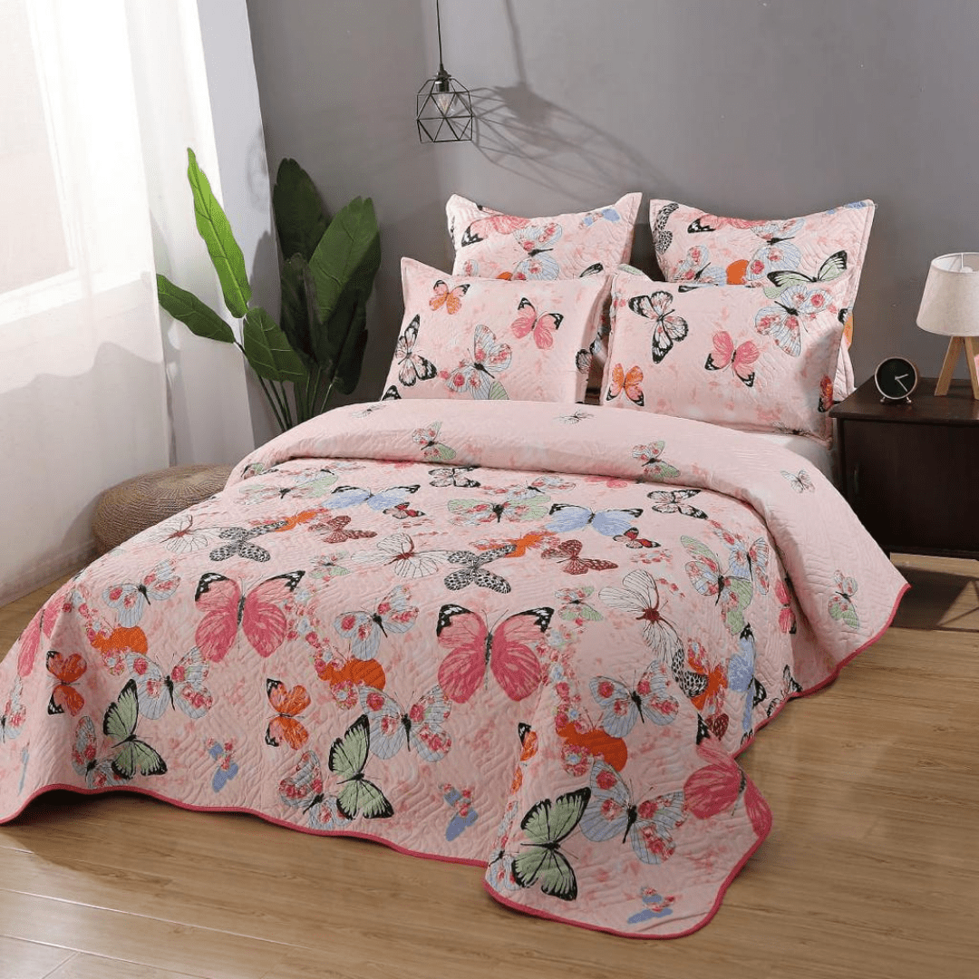 Set 5 Piese Cuvertura de Pat DUO + 2 Fete de Perna 50x70 cm + 2 Fete Perna 70x70 cm - Roz Fluturi Multicolori - CVBS105A