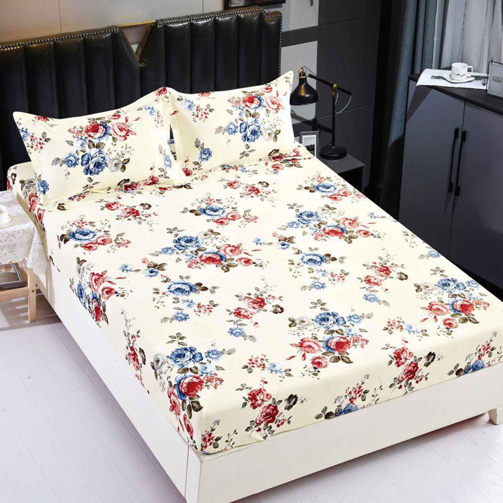 Cearceaf din Finet cu Elastic - 160/180x200 + 2 Fete Perna, Trandafiri Rosii si Albastri - CEF0135