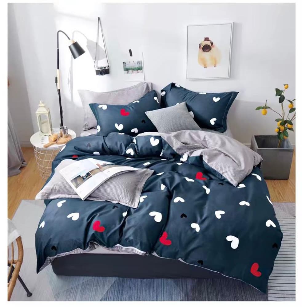Lenjerie DUO Bumbac Satinat Visinie Crini Albi LBD0149Cearceaf cu Elastic - 160/180x200 + 2 Fete Perna, Albastra Inimioare Negre - CE0039