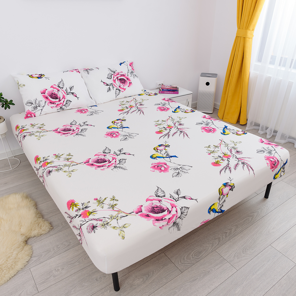 Lenjerie de Pat 3 Piese din Bumbac 100% - Cearceaf cu Elastic 160x200 + 2 Fete Perna 50x70 - Gradina Roz - CEB0002