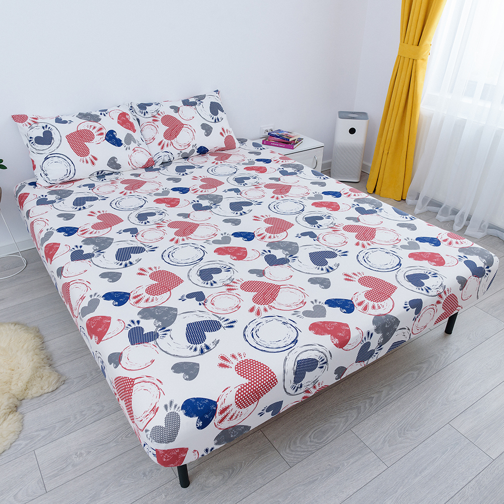 Lenjerie de Pat 3 Piese din Bumbac 100% - Cearceaf cu Elastic 160x200 + 2 Fete Perna 50x70 - Rosu Albastru Inimioare - CEB0024