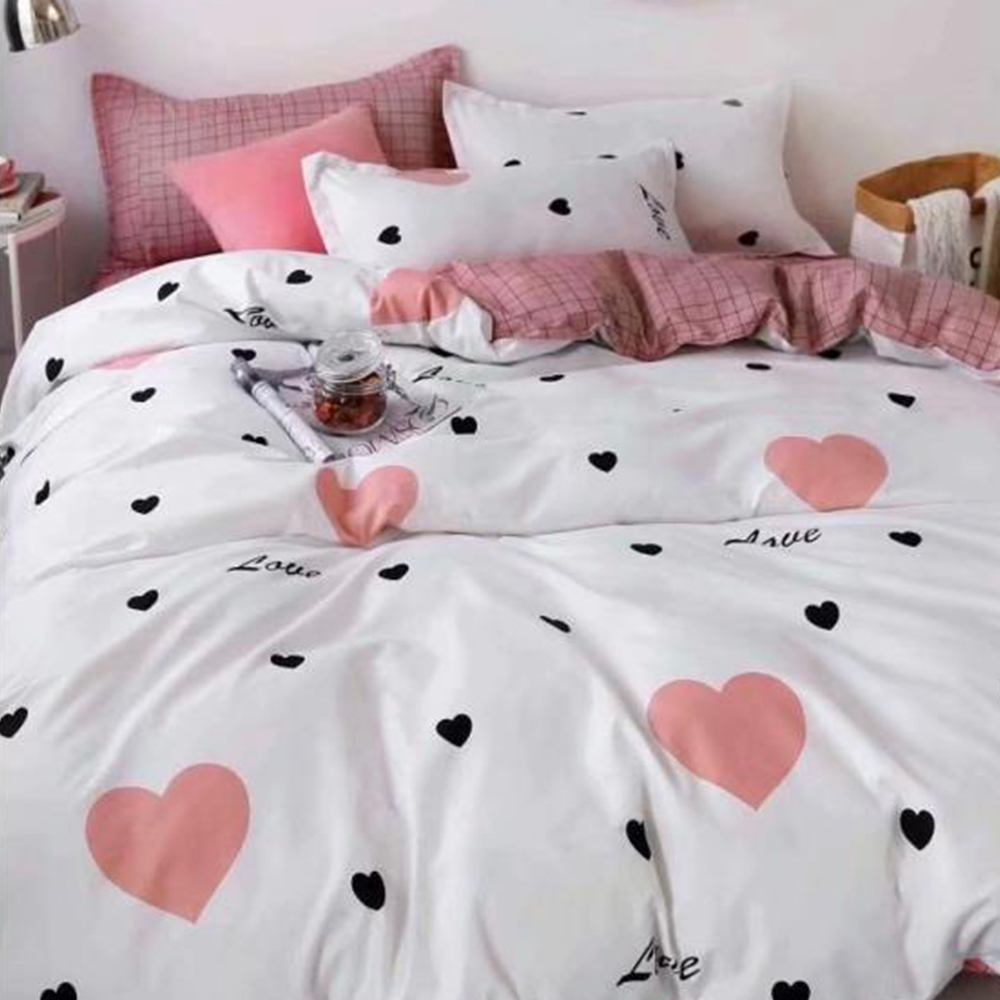 Lenjerie DUO Bumbac Satinat Alba Inimioare Roz si Negre LBD0156