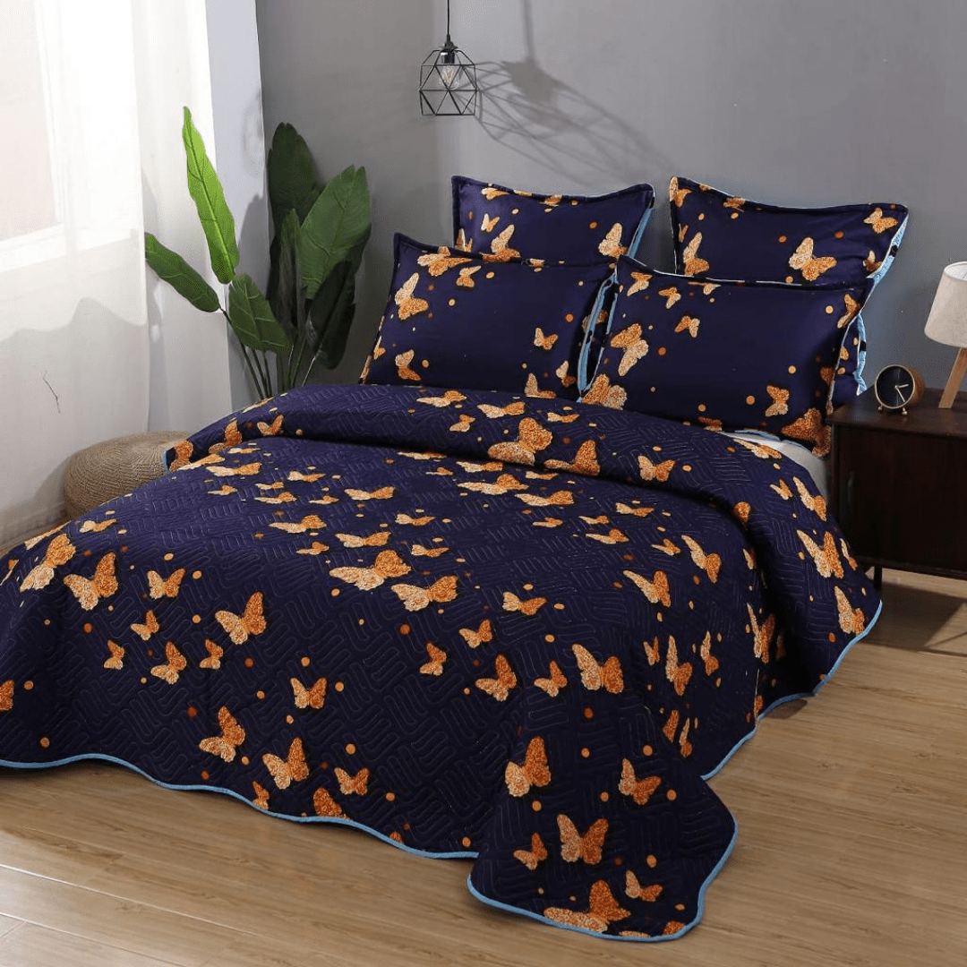 Set 5 Piese Cuvertura de Pat DUO + 2 Fete de Perna 50x70 cm + 2 Fete Perna 70x70 cm - Albastra Fluturi Aurii - CVBS107B