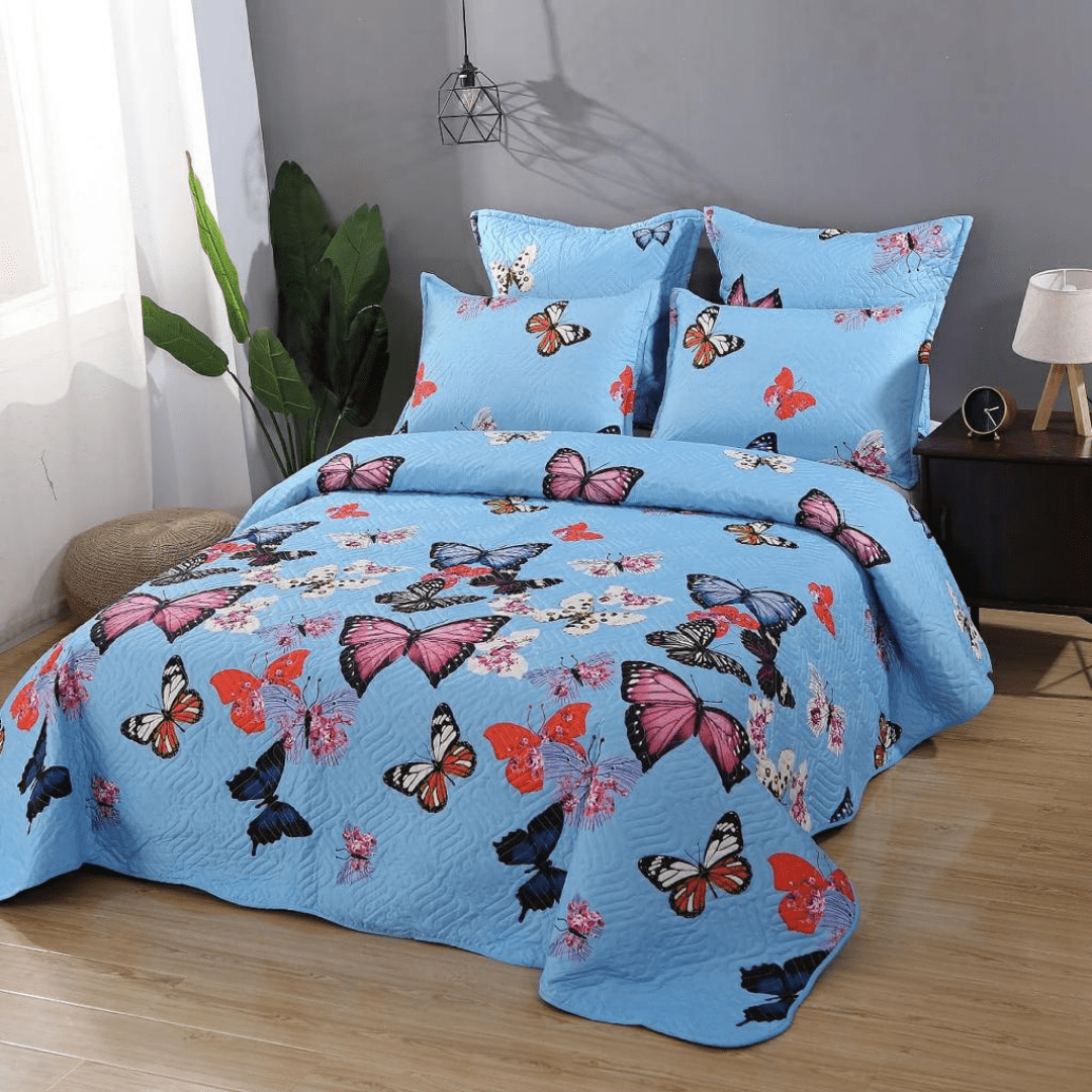 Set 5 Piese Cuvertura de Pat DUO + 2 Fete de Perna 50x70 cm + 2 Fete Perna 70x70 cm - Albastra Fluturi Colorati - CVBS104A