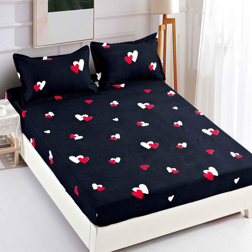Lenjerie DUO Bumbac Satinat Visinie Crini Albi LBD0149Cearceaf cu Elastic - 160/180x200 + 2 Fete Perna, Albastra Inimioare Negre - CE0039