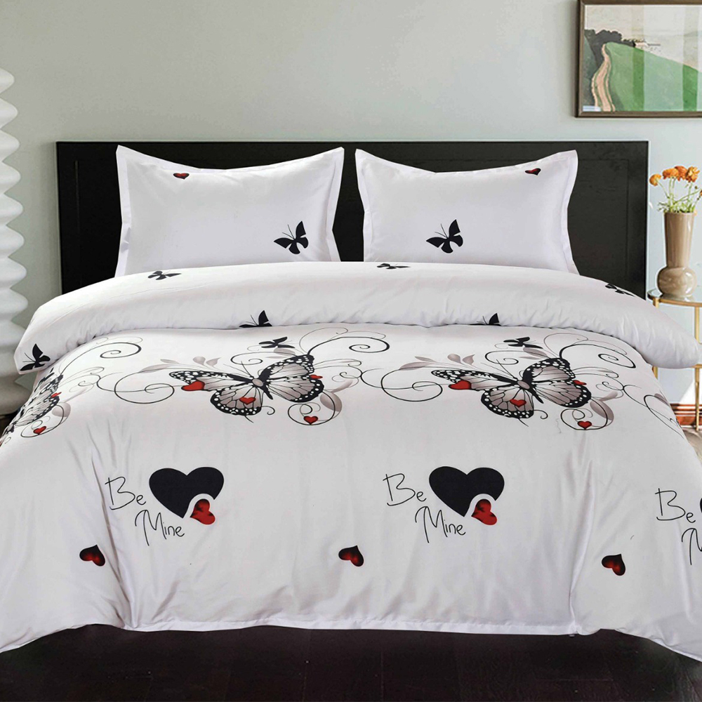 Lenjerie DUO Bumbac Satinat Visinie Crini Albi LBD0149Cearceaf cu Elastic - 160/180x200 + 2 Fete Perna, Albastra Inimioare Negre - CE0039
