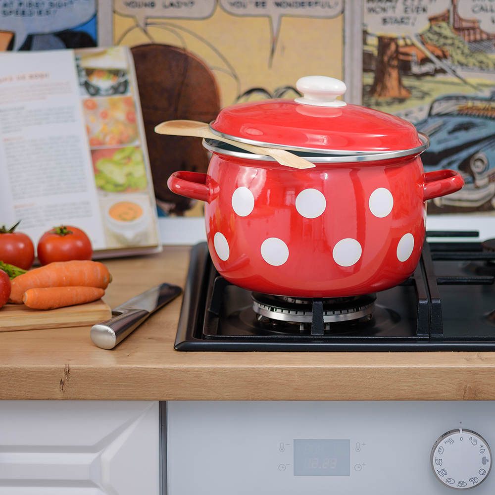 Vas Bombat pentru Cartofi - Model Negru Picatele Albe OER0063Ceaun Rosu Emailat cu Maner Sarma - 28 cm - OER0065