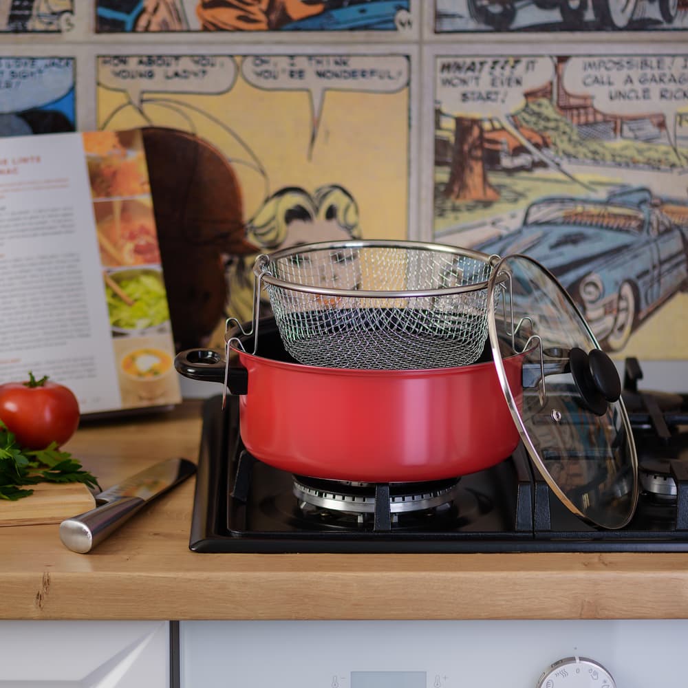 Pentru fanii cartofilor prăjiți și nu numai, acest set de 3 piese format din friteuză cu capac și coș este intrumentul ideal din bucătărie! Oala este confecționată din oțel cu acoperire antiaderentă, capacul este realizat din sticlă termorezistentă, iar coșul este făcut dintr-un aliaj rezistent expunerii la căldură și ulei încins. Prin detașarea coșului, friteuza poate fi transformată cu ușurință în oală de gătit pentru supe și ciorbe, având o capacitate generoasă și o circumferință de 24 cm. Este ideală pentru a fierbe, prăji sau înnăbuși orice fel de preparate, inclusiv fructe de mare.