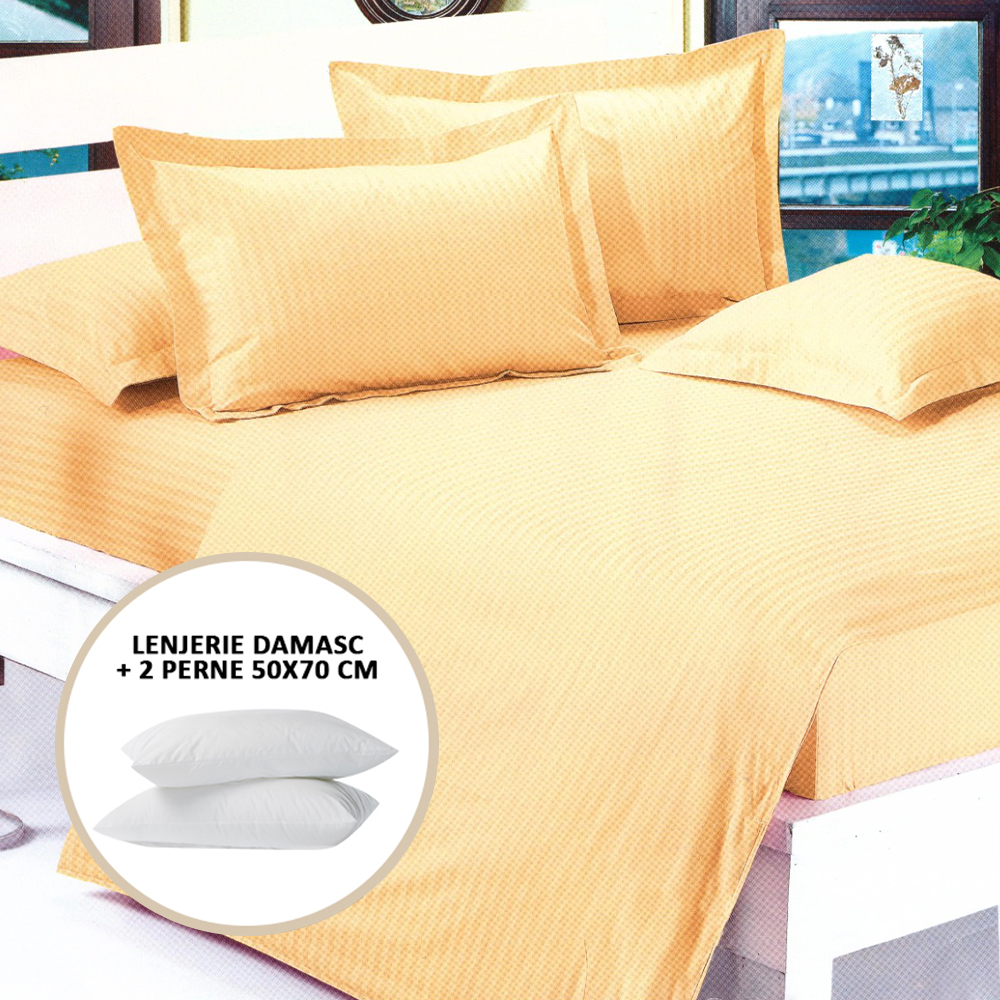 Set Lenjerie Damasc Galben Gutuie 6 Piese + 2 Perne Hypo-Alergice 50x70cm