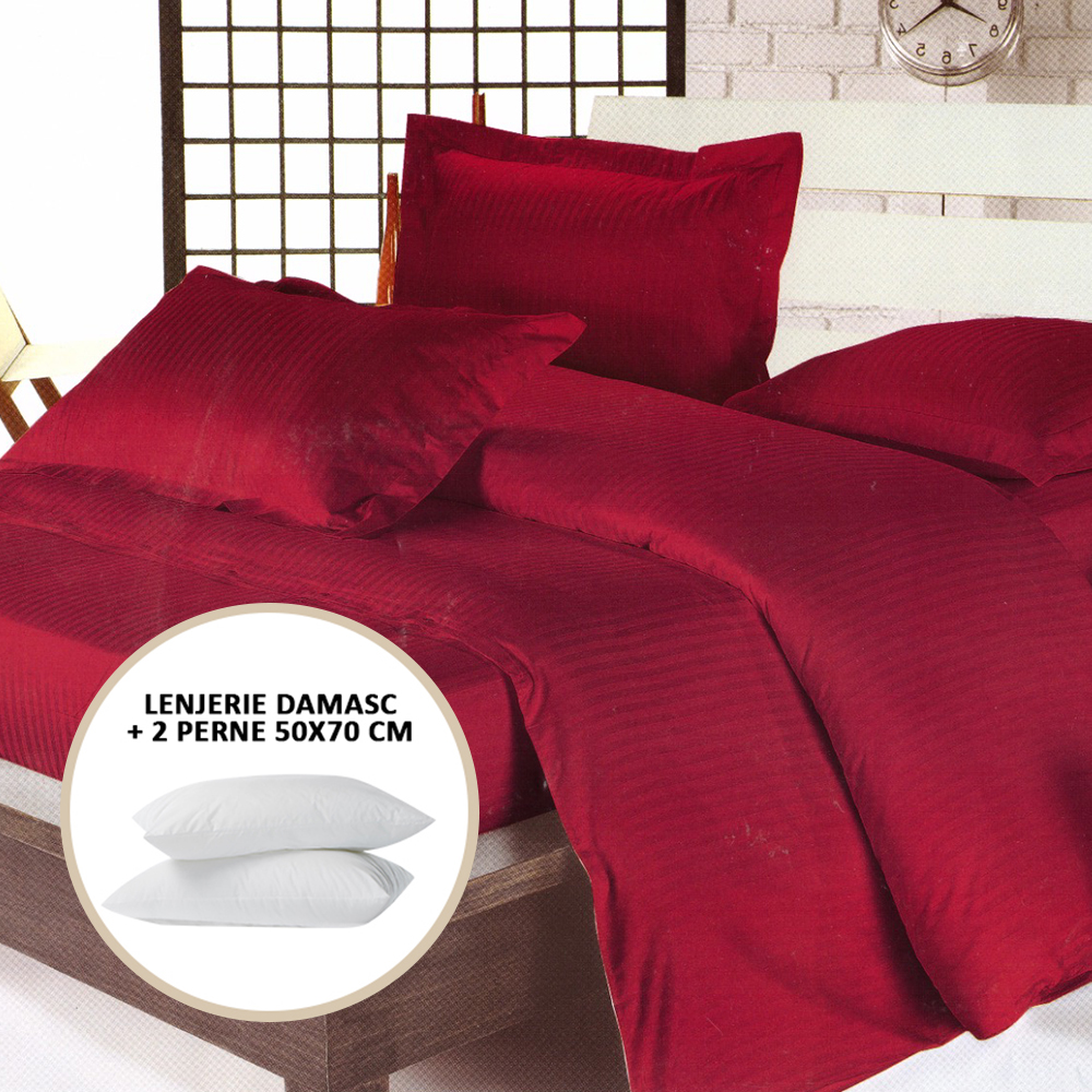 Set Lenjerie Damasc Rosu 6 Piese + 2 Perne Hypo-Alergice 50x70cm
